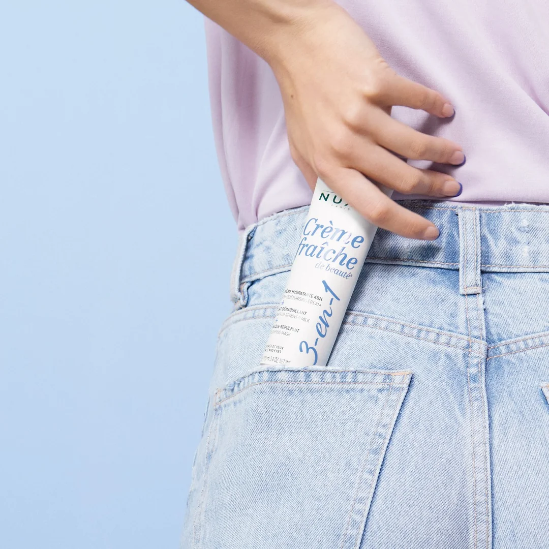 Nuxe Crème fraîche® de Beauté nawilżający krem 3 w 1, 100 ml to innowacyjny produkt, który możesz wykorzystać na trzy różne sposoby: jako intensywnie nawilżający krem, jako mleczko do demakijażu oraz jako maskę na twarz. Jest to doskonały kosmetyk, który z powodzeniem zmieścisz w swojej podróżnej kosmetyczce, nie rezygnując z pielęgnacji.